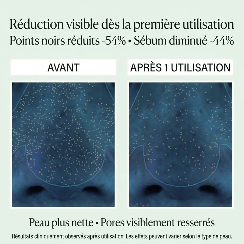 Une fois appliqué, le masque réagit au contact de l'air et forme une mousse dense de micro-bulles. C'est cette effervescence qui décole en douceur le sébum, les impuretés, les points noirs et les résidus incrustés dans les pores, sans frotter, sans agresser.