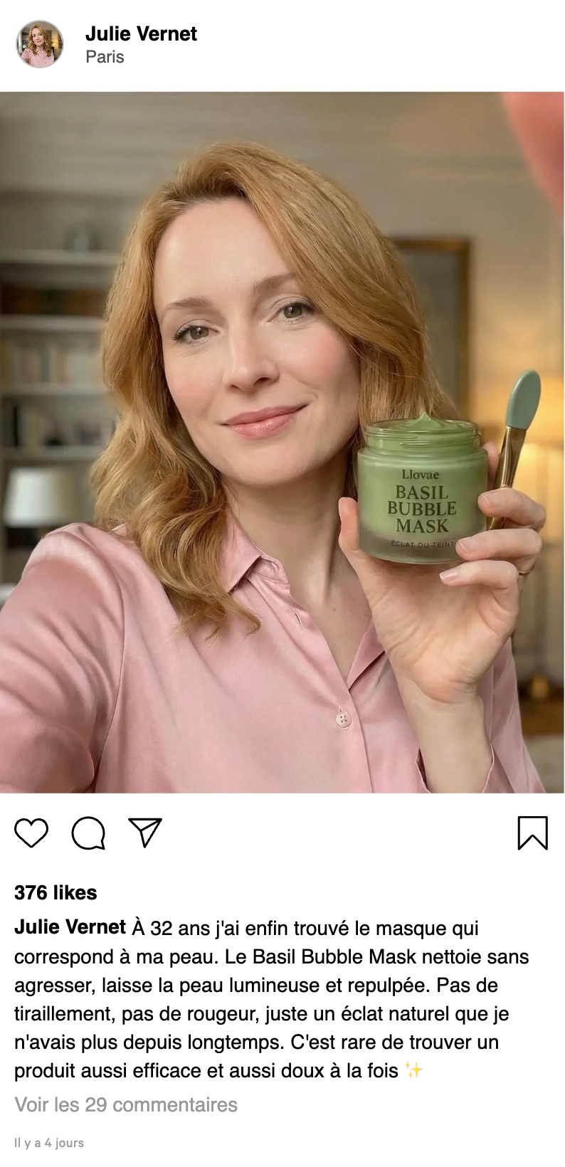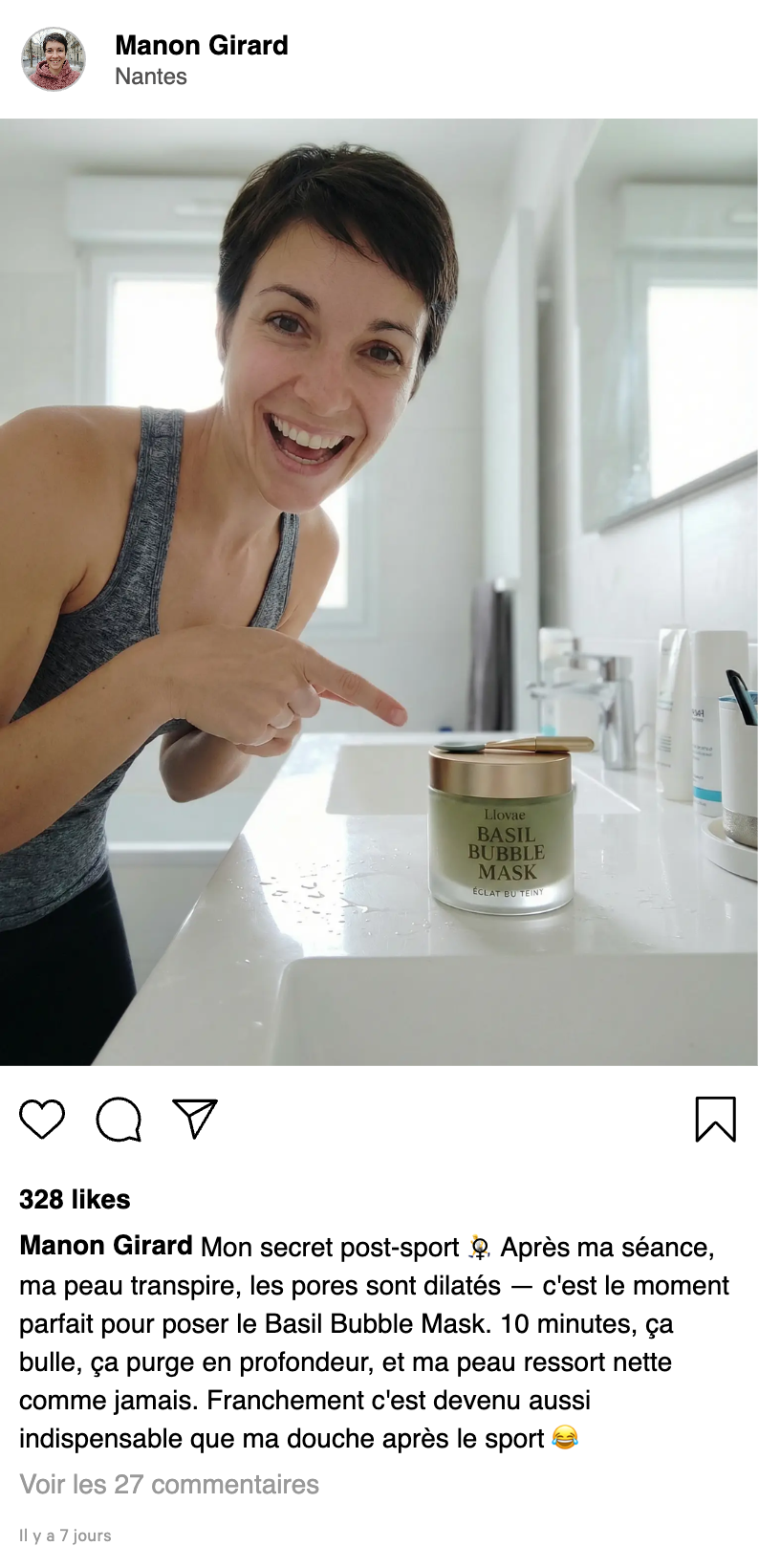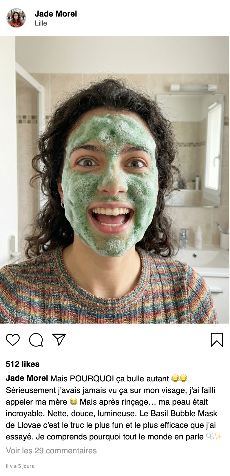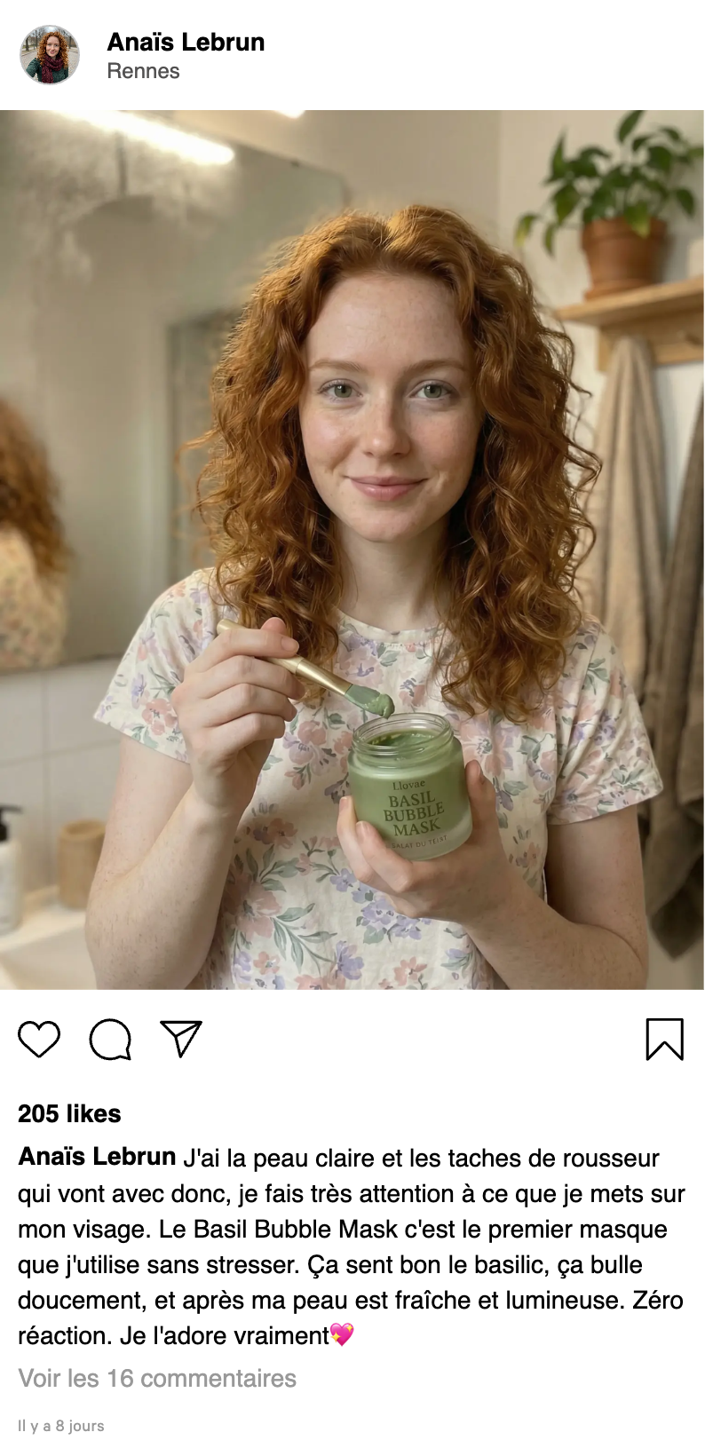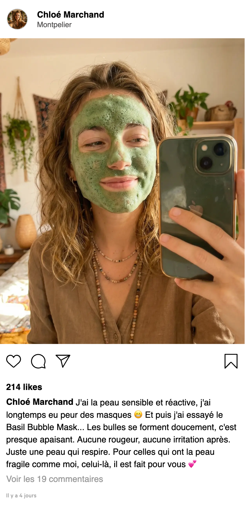 Le Basil Bubble Mask a une odeur fraîche et herbacée, naturellement apportée par l'extrait de basilic sacré et les actifs botaniques de la formule. C'est une senteur légère et agréable, rien de chimique ni de parfumé.